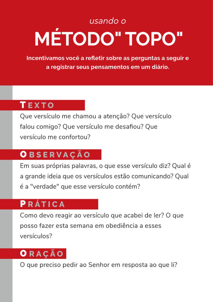 O devocional de cada semana terá diferentes leituras das Escrituras e perguntas de reflexão para cada dia, de segunda a sexta-feira, com um foco diferente a cada dia.